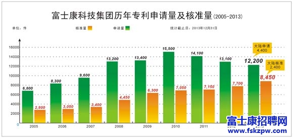 富士康多年快速增長的專利申請及核準成果斐然,成為華人企業(yè)馳騁全球科技業(yè)的智權先鋒。         截至2013年底,集團全球專利申請已累計127500件(大陸申請47200件),核準量達到63300件(大陸核準23800件)。